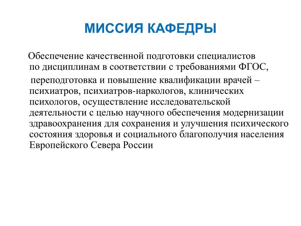 МИССИЯ КАФЕДРЫ Обеспечение качественной подготовки специалистов по дисциплинам в соответствии с требованиями ФГОС, переподготовка и повышение квалификации врачей – психиатров, психиатров-наркологов, клинических психологов, осуществление исследовательской деятельности с целью научного обеспечения модернизации здравоохранения для сохранения и улучшения психического состояния здоровья и социального благополучия населения Европейского Севера России