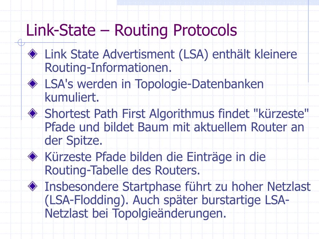 Link-State – Routing Protocols • Link State Advertisment (LSA) enthält kleinere Routing-Informationen. • LSA's werden in Topologie-Datenbanken kumuliert. • Shortest Path First Algorithmus findet "kürzeste" Pfade und bildet Baum mit aktuellem Router an der Spitze. • Kürzeste Pfade bilden die Einträge in die Routing-Tabelle des Routers. • Insbesondere Startphase führt zu hoher Netzlast (LSA-Flodding). Auch später burstartige LSA-Netzlast bei Topolgieänderungen.