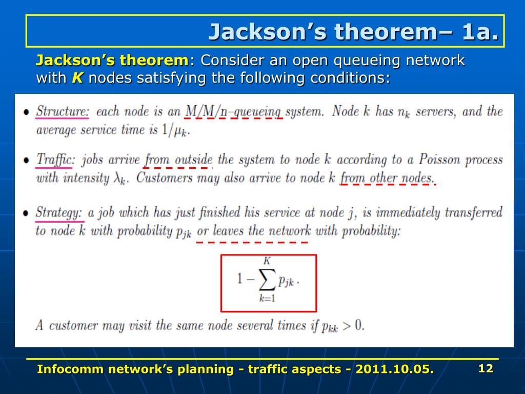 Jackson’s theorem – 1c. The key point of Jackson's theorem is that: each node can beconsidered independently of all other nodes and that the state probabilities are as for Erlang'sdelay system. (Erlang’s C formula.) This simplifies thecalculationof the state space probabilities significantly. Jackson's first model thus only deals with open queueing networks. Example: Open queuing network consisting of two M|M|1 systems in series