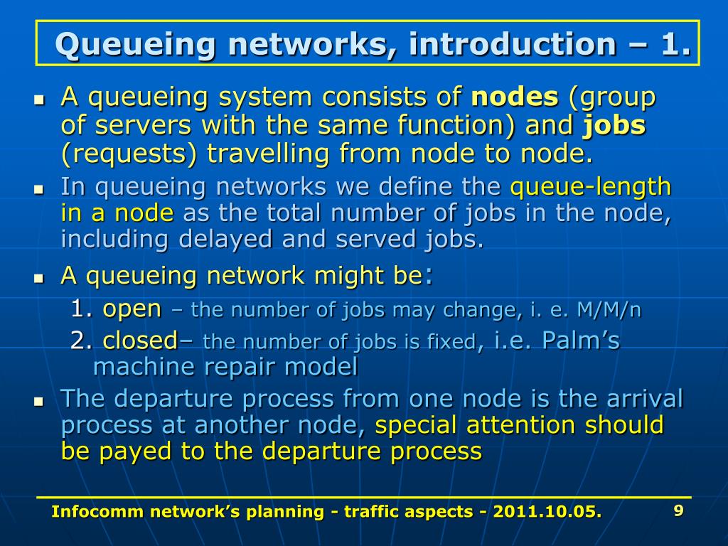 Queueing networks, introduction – 1. • A queueing system consists of nodes (group of servers with the same function) and jobs (requests) travelling from node to node. • In queueing networks we define the queue-length in a node as the total number of jobs in the node, including delayed and servedjobs. • A queueing network might be: • open – the number of jobs may change, i. e. M/M/n • closed– the number of jobs is fixed, i.e. Palm’s machine repair model • The departure process from one node is the arrival process at another node, special attention should be payed to the departure process