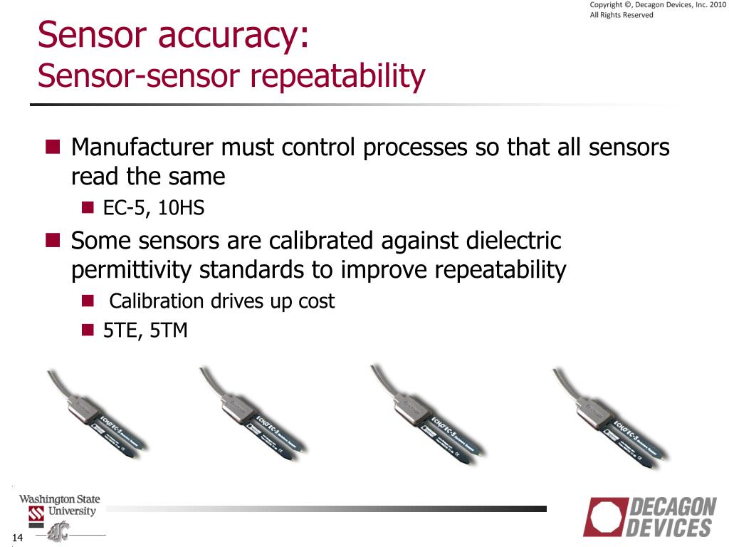 Sensor accuracy: Sensor-sensor repeatability • Manufacturer must control processes so that all sensors read the same • EC-5, 10HS • Some sensors are calibrated against dielectric permittivity standards to improve repeatability • Calibration drives up cost • 5TE, 5TM