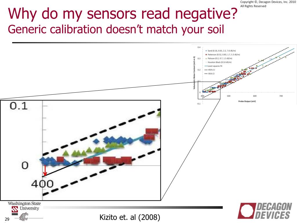 Why do my sensors read negative?Generic calibration doesn’t match your soil Kizito et. al (2008)