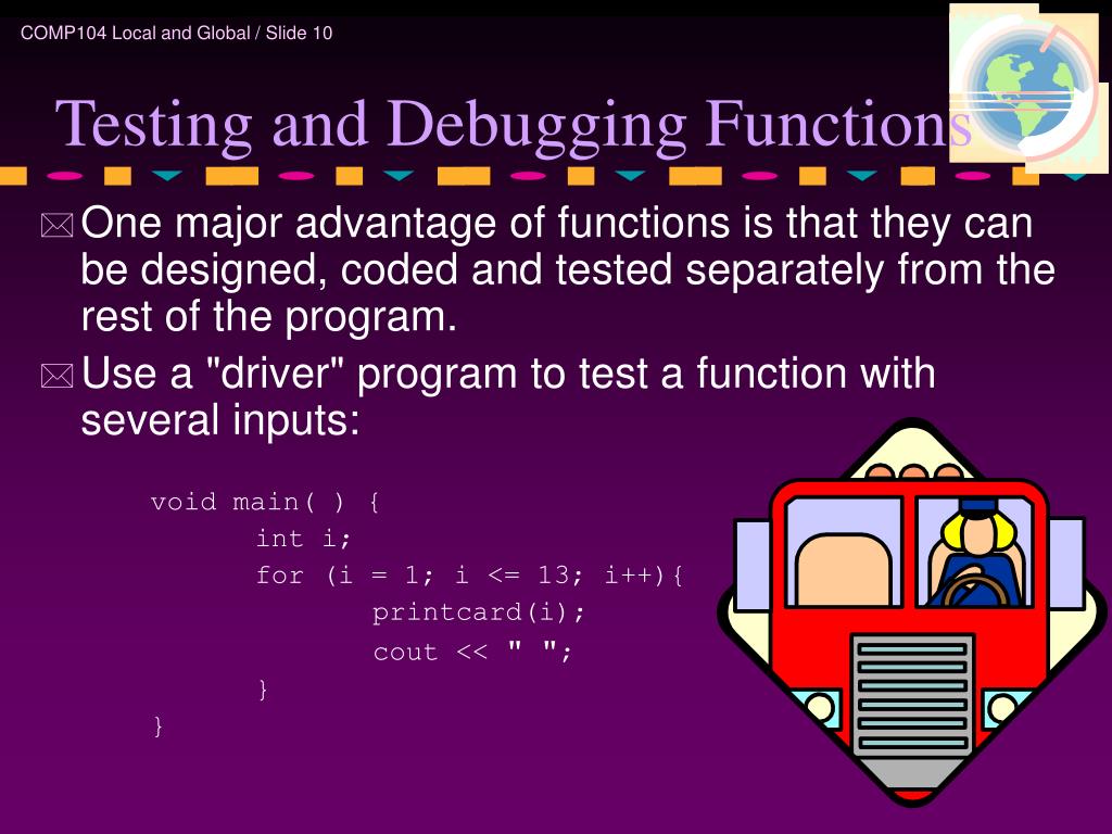 Testing and Debugging Functions • One major advantage of functions is that they can be designed, coded and tested separately from the rest of the program. • Use a "driver" program to test a function with several inputs: void main( ) { int i; for (i = 1; i <= 13; i++){ printcard(i); cout << ""; } }