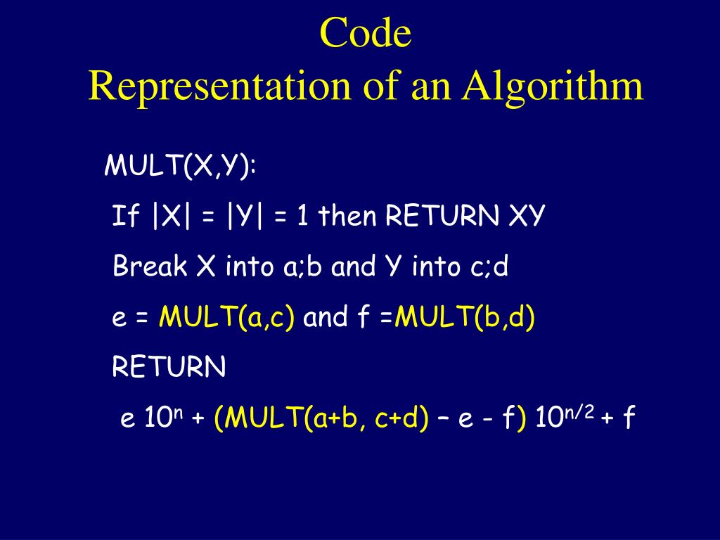 Code Representation of an Algorithm MULT(X,Y): If |X| = |Y| = 1 then RETURN XY Break X into a;b and Y into c;d e = MULT(a,c) and f =MULT(b,d) RETURN e 10n + (MULT(a+b, c+d) – e - f) 10n/2 + f