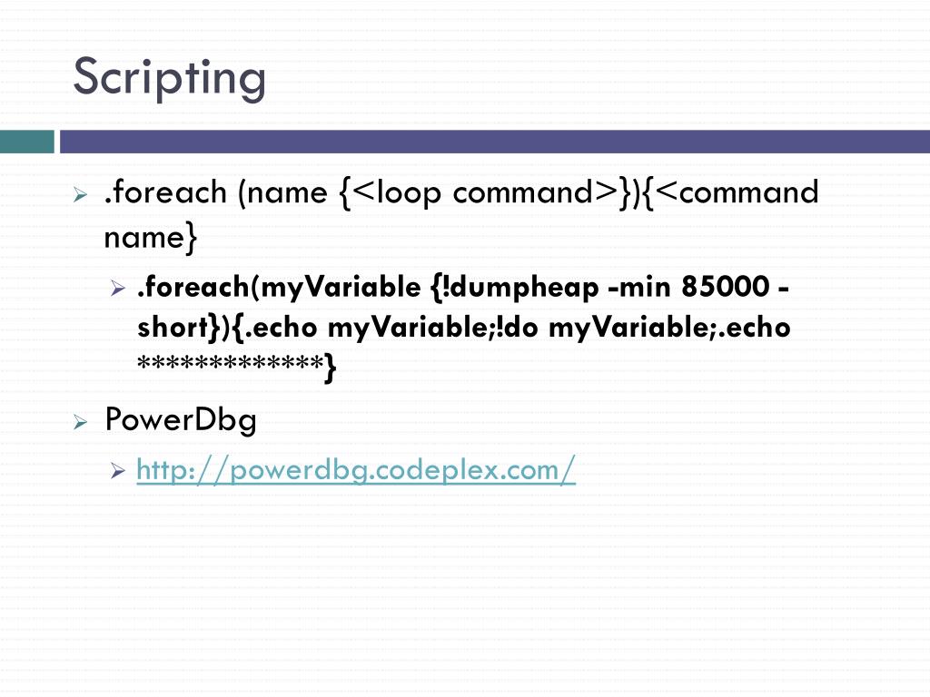 Scripting • .foreach (name {<loop command>}){<command name} • .foreach(myVariable {!dumpheap -min 85000 -short}){.echo myVariable;!do myVariable;.echo *************} • PowerDbg • http://powerdbg.codeplex.com/
