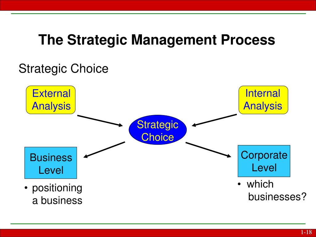 Internal Analysis External Analysis Strategic Choice Corporate Level Business Level The Strategic Management Process Strategic Choice • which businesses? • positioning a business