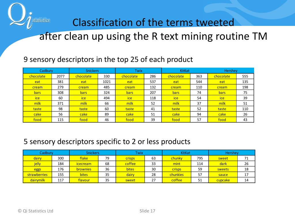 Classification of the termstweetedafter clean up using the R textmining routine TM 9 sensorydescriptors in the top 25 of eachproduct 5 sensorydescriptorsspecific to 2 or lessproducts Slide 17