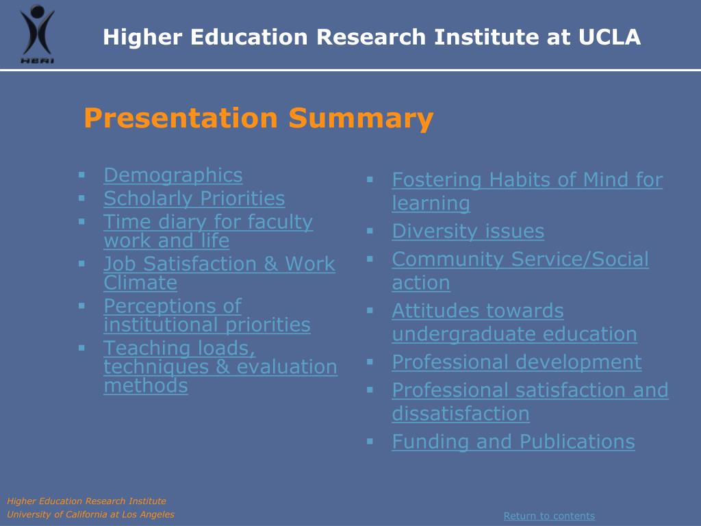 Demographics Scholarly Priorities Time diary for faculty work and life Job Satisfaction & Work Climate Perceptions of institutional priorities Teaching loads, techniques & evaluation methods Fostering Habits of Mind for learning Diversity issues Community Service/Social action Attitudes towards undergraduate education Professional development Professional satisfaction and dissatisfaction Funding and Publications Presentation Summary Higher Education Research Institute University of California at Los Angeles