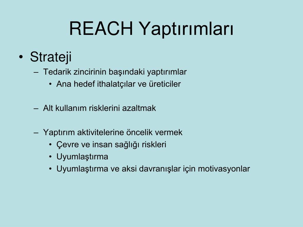 REACH Yaptırımları • Strateji • Tedarik zincirinin başındaki yaptırımlar • Ana hedef ithalatçılar ve üreticiler • Alt kullanım risklerini azaltmak • Yaptırım aktivitelerine öncelik vermek • Çevre ve insan sağlığı riskleri • Uyumlaştırma • Uyumlaştırma ve aksi davranışlar için motivasyonlar