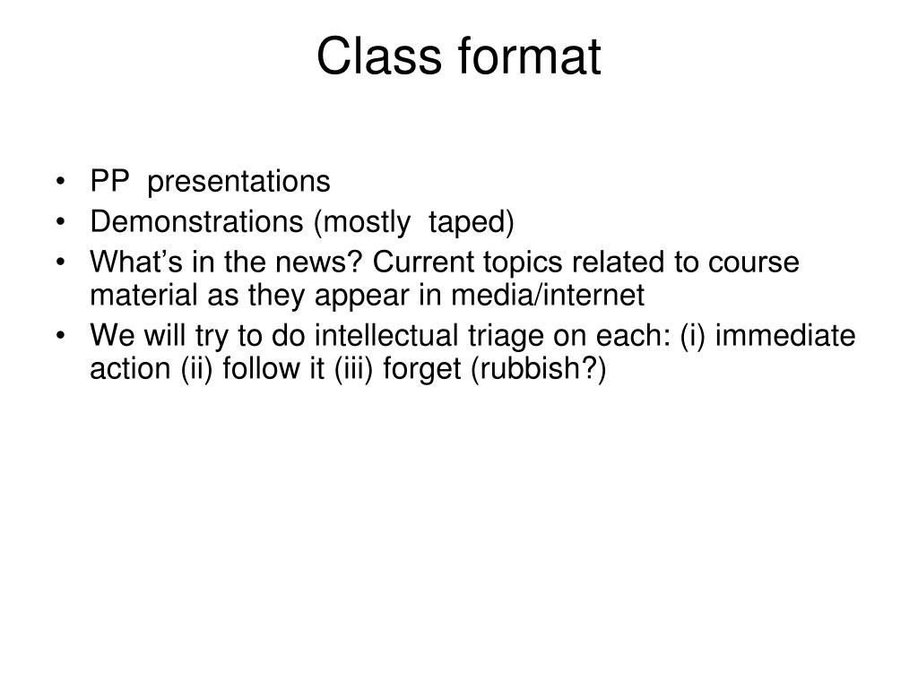 Class format • PP presentations • Demonstrations (mostly taped) • What’s in the news? Current topics related to course material as they appear in media/internet • We will try to do intellectual triage on each: (i) immediate action (ii) follow it (iii) forget (rubbish?)