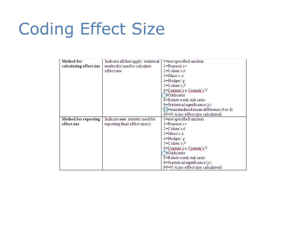 Training and Calibrating Coders • Start with a small sub-sample of representative studies (i.e., practice coding) • Assess interrater reliability • Identify areas of inconsistency/disagreement • Modify coding procedures, forms as necessary (reassess after modification) • Regular meetings (develop normative understandings) • Use specialized coders (e.g., computing effect sizes by hand or using effect size calculators) • In the end, a consensus procedure will be necessary for “disagreeing” codes