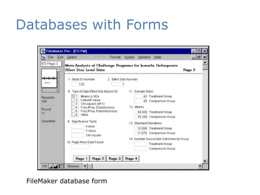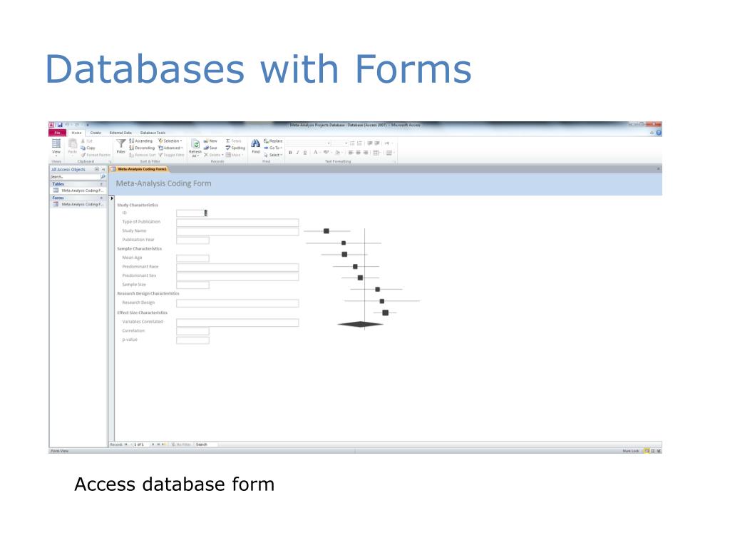 Coding Directly to Database • Advantages • Avoids additional step of transferring data from paper to computer • Easy access to data for data cleanup • Database can perform calculations during coding process (e.g., calculation of effect sizes) • Faster coding • Can perform queries to extract relevant data • Disadvantages • Can be time consuming to set up • Requires a higher level of computer skill