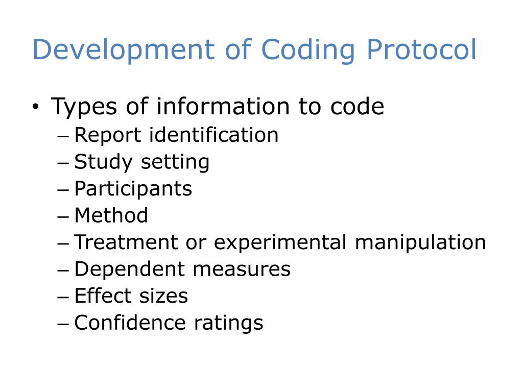 Development of Coding Protocol • Types of information to code • Report identification • Study setting • Participants • Method • Treatment or experimental manipulation • Dependent measures • Effect sizes • Confidence ratings