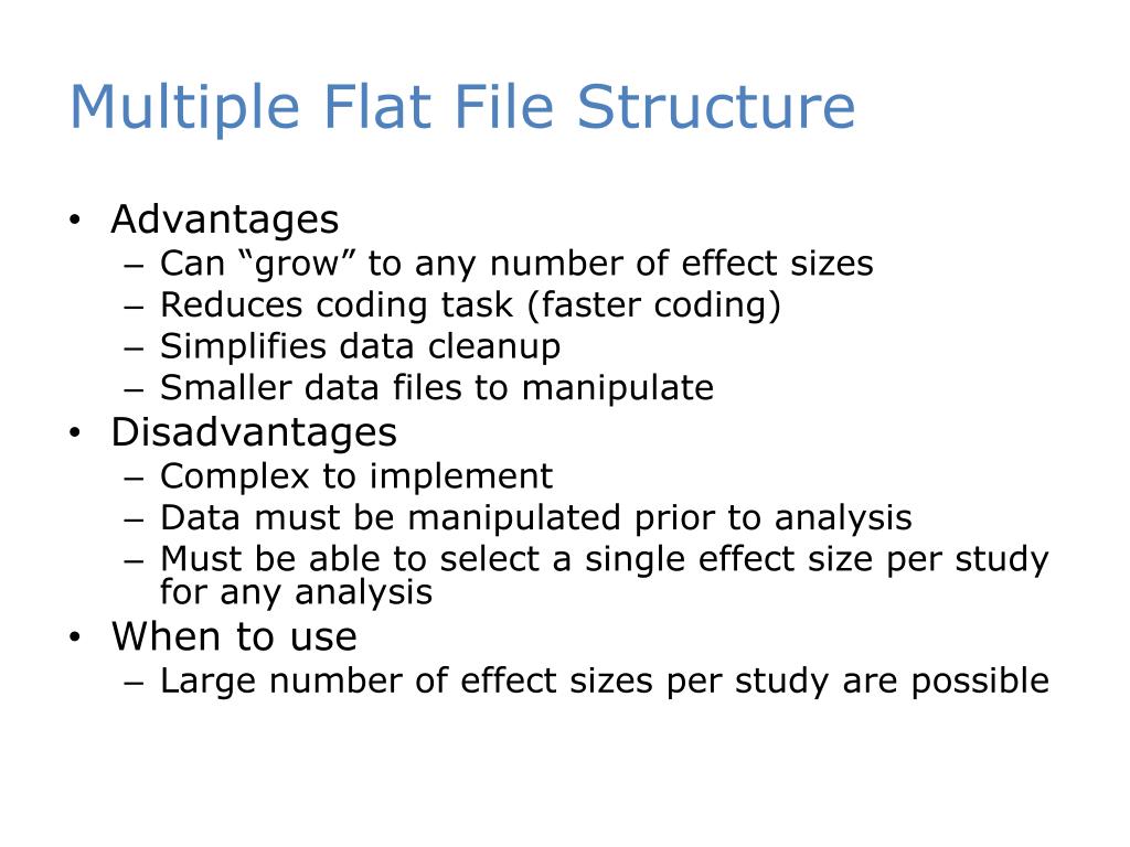 Multiple Flat File Structure • Advantages • Can “grow” to any number of effect sizes • Reduces coding task (faster coding) • Simplifies data cleanup • Smaller data files to manipulate • Disadvantages • Complex to implement • Data must be manipulated prior to analysis • Must be able to select a single effect size per study for any analysis • When to use • Large number of effect sizes per study are possible