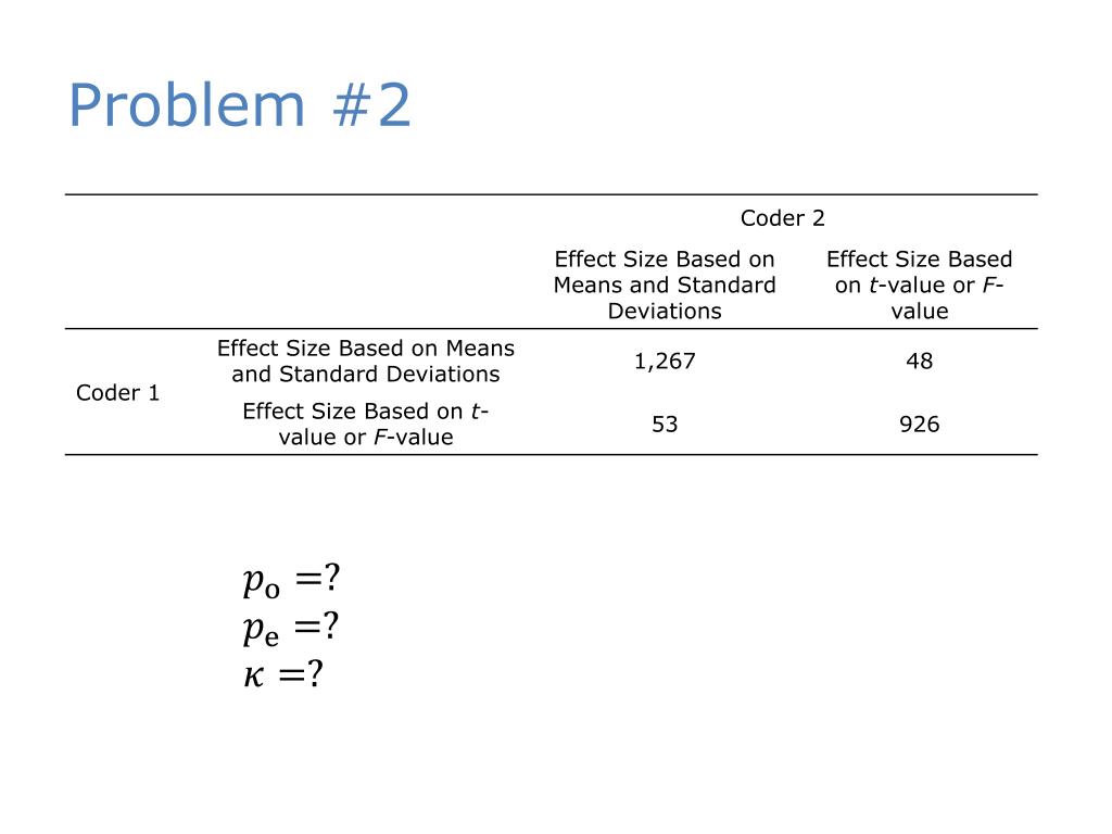 Today’s In-Class Activity • Individually, or in your working groups, calculate the coefficient of observed agreement (), expected agreement (), and Cohen’s kappa () for problems #1, #2, and #3 on the following slides • How reliable is each in terms of observed agreement and taking chance agreements into account?