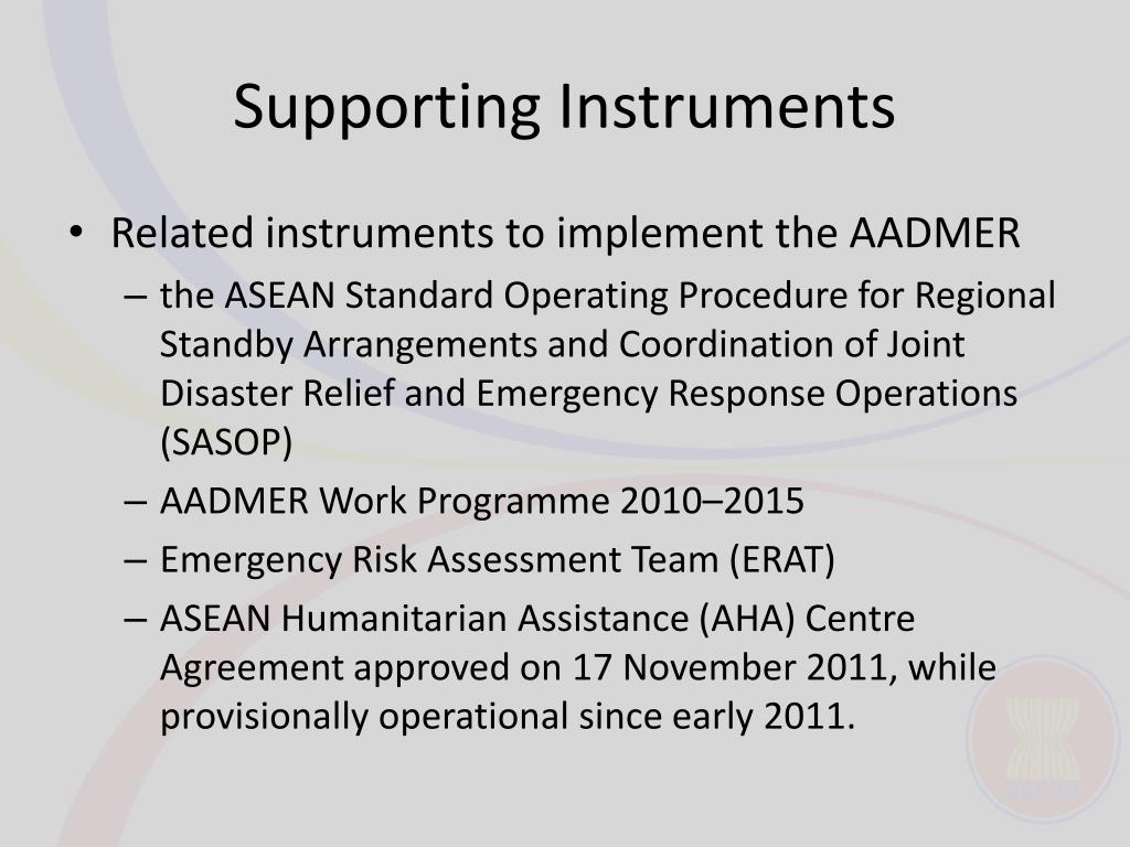 Supporting Instruments • Related instruments to implement the AADMER • the ASEAN Standard Operating Procedure for Regional Standby Arrangements and Coordination of Joint Disaster Relief and Emergency Response Operations (SASOP) • AADMER Work Programme 2010–2015 • Emergency Risk Assessment Team (ERAT) • ASEAN Humanitarian Assistance (AHA) Centre Agreement approved on 17 November 2011, while provisionally operational since early 2011.