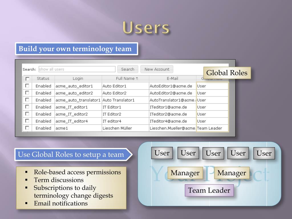 User Management • Sophisticated Access Setup • Subscriptions • Terminology change digests • Object Permissions • Different user roles • Different levels (project, glossary, language)