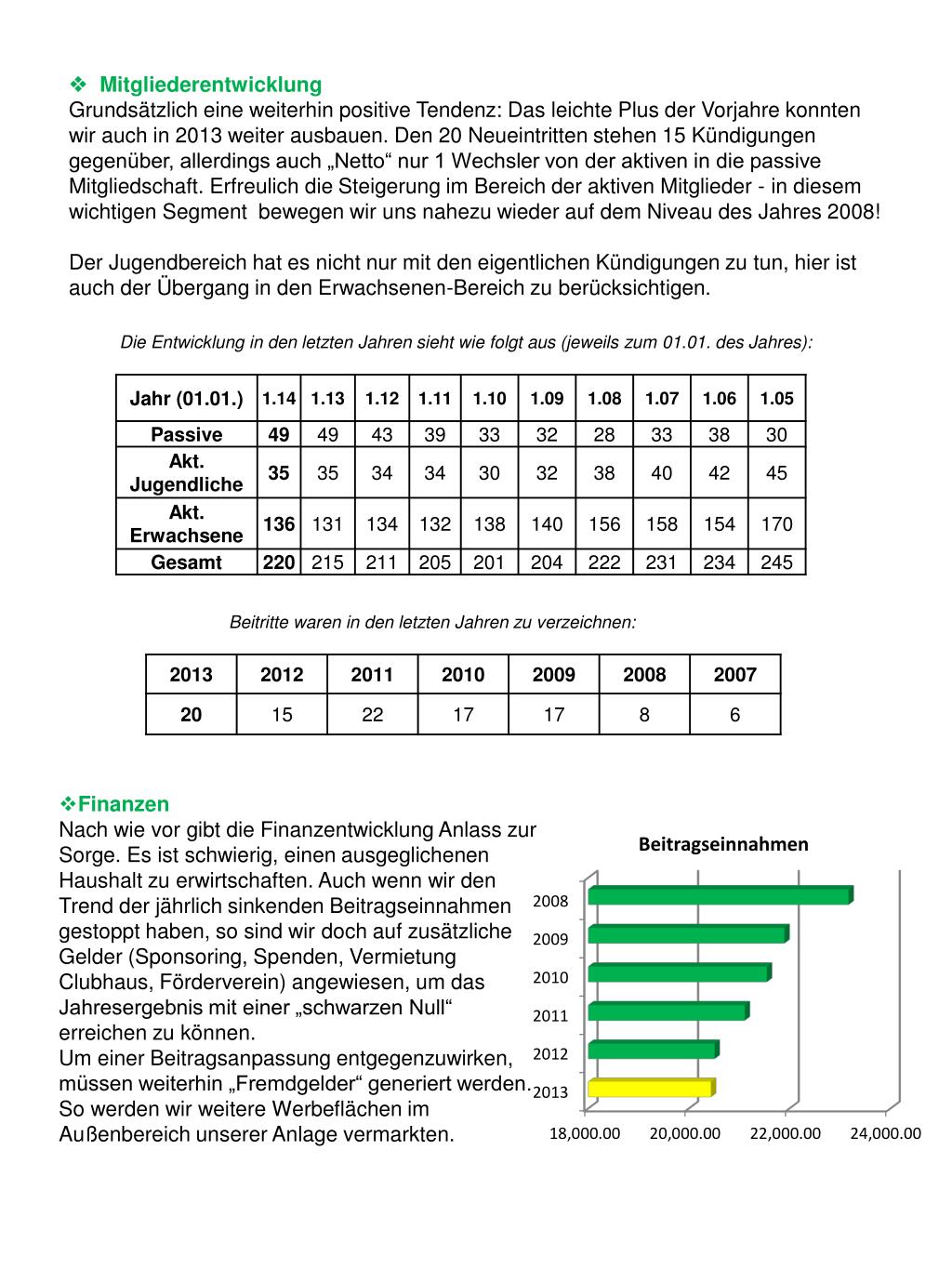 Mitgliederentwicklung Grundsätzlich eine weiterhin positive Tendenz: Das leichte Plus der Vorjahre konnten wir auch in 2013 weiter ausbauen. Den 20 Neueintritten stehen 15 Kündigungen gegenüber, allerdings auch „Netto“ nur 1 Wechsler von der aktiven in die passive Mitgliedschaft. Erfreulich die Steigerung im Bereich der aktiven Mitglieder - in diesem wichtigen Segment bewegen wir uns nahezu wieder auf dem Niveau des Jahres 2008! Der Jugendbereich hat es nicht nur mit den eigentlichen Kündigungen zu tun, hier ist auch der Übergang in den Erwachsenen-Bereich zu berücksichtigen. Die Entwicklung in den letzten Jahren sieht wie folgt aus (jeweils zum 01.01. des Jahres): • Beitritte waren in den letzten Jahren zu verzeichnen: • Finanzen • Nach wie vor gibt die Finanzentwicklung Anlass zur Sorge. Es ist schwierig, einen ausgeglichenen Haushalt zu erwirtschaften. Auch wenn wir den Trend der jährlich sinkenden Beitragseinnahmen gestoppt haben, so sind wir doch auf zusätzliche Gelder (Sponsoring, Spenden, Vermietung Clubhaus, Förderverein) angewiesen, um das Jahresergebnis mit einer „schwarzen Null“ erreichen zu können. • Um einer Beitragsanpassung entgegenzuwirken, müssen weiterhin „Fremdgelder“ generiert werden. So werden wir weitere Werbeflächen im Außenbereich unserer Anlage vermarkten. Beitragseinnahmen