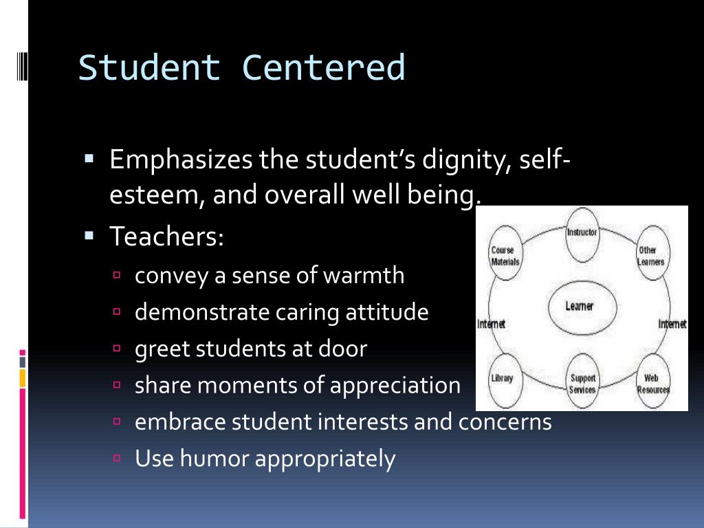 Student Centered • Emphasizes the student’s dignity, self-esteem, and overall well being. • Teachers: • convey a sense of warmth • demonstrate caring attitude • greet students at door • share moments of appreciation • embrace student interests and concerns • Use humor appropriately