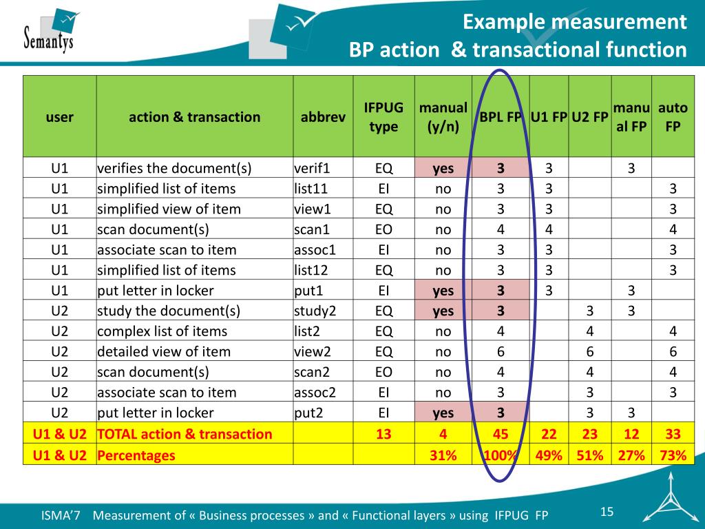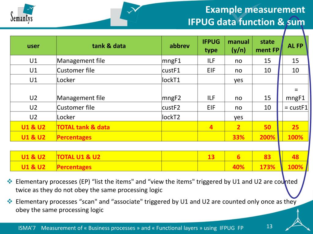 Example measurementIFPUG data function & sum • Elementary processes (EP) “list the items" and “view the items" triggered by U1 and U2 are counted twice as they do not obey the same processing logic • Elementary processes “scan" and “associate" triggered by U1 and U2 are counted only once as they obey the same processing logic