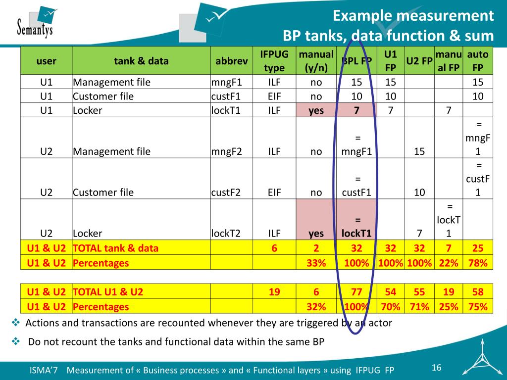Example measurementBP tanks, data function & sum • Actions and transactions are recountedwheneverthey are triggered by an actor • Do not recount the tanks and functional data within the same BP