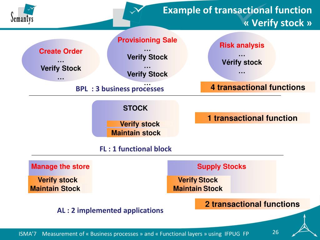 Example of transactional function« Verify stock » Provisioning Sale…Verify Stock… Verify Stock… Riskanalysis…Vérify stock… CreateOrder…Verify Stock… 4 transactional functions BPL : 3 business processes STOCK 1 transactional function Verify stock Maintain stock FL : 1 functional block Manage the store Supply Stocks Verify stock VerifyStock Maintain Stock MaintainStock 2 transactional functions AL : 2 implemented applications