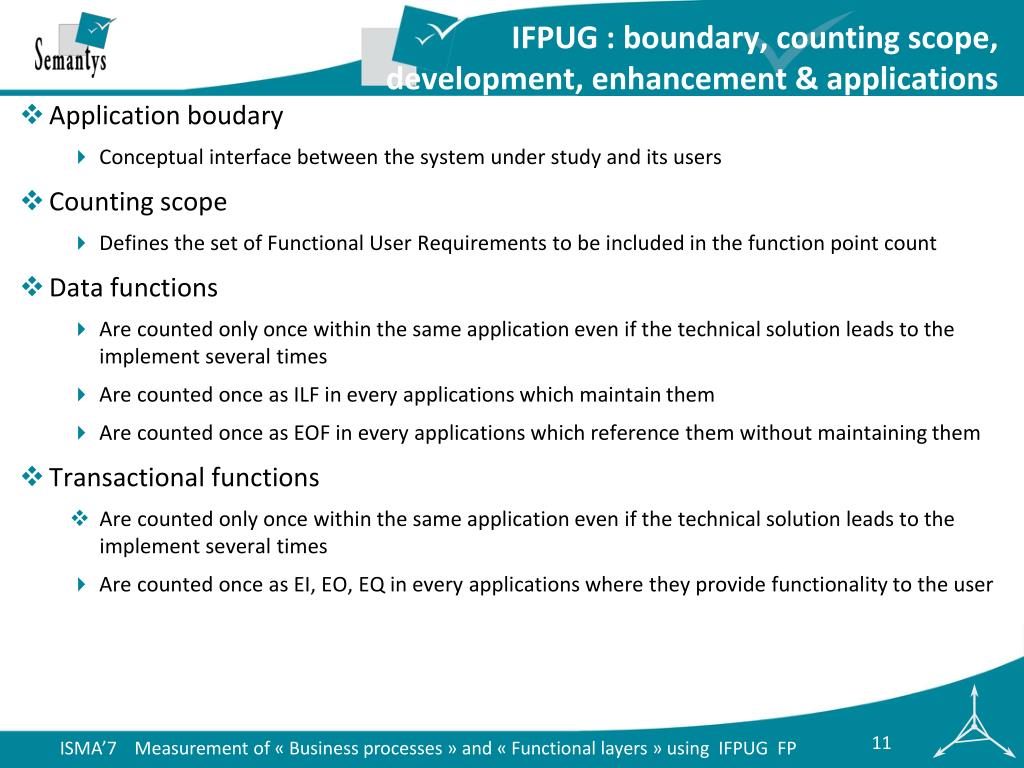 IFPUG : boundary, counting scope,development, enhancement & applications • Application boudary • Conceptual interface between the system under study and its users • Counting scope • Defines the set of Functional User Requirements to be included in the function point count • Data functions • Are counted only once within the same application even if the technical solution leads to the implement several times • Are counted once as ILF in every applications which maintain them • Are counted once as EOF in every applications which reference them without maintaining them • Transactional functions • Are counted only once within the same application even if the technical solution leads to the implement several times • Are counted once as EI, EO, EQ in every applications where they provide functionality to the user