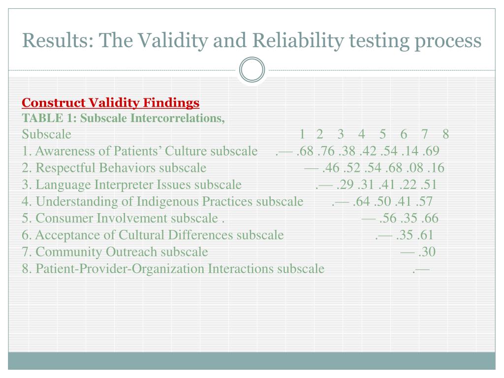 Results: The Validity and Reliability testing process Construct Validity Findings TABLE 1: Subscale Intercorrelations, Subscale 1 2 3 4 5 6 7 8 1. Awareness of Patients’ Culture subscale .— .68 .76 .38 .42 .54 .14 .69 2. Respectful Behaviors subscale — .46 .52 .54 .68 .08 .16 3. Language Interpreter Issues subscale .— .29 .31 .41 .22 .51 4. Understanding of Indigenous Practices subscale .— .64 .50 .41 .57 5. Consumer Involvement subscale . — .56 .35 .66 6. Acceptance of Cultural Differences subscale .— .35 .61 7. Community Outreach subscale — .30 8. Patient-Provider-Organization Interactions subscale .—