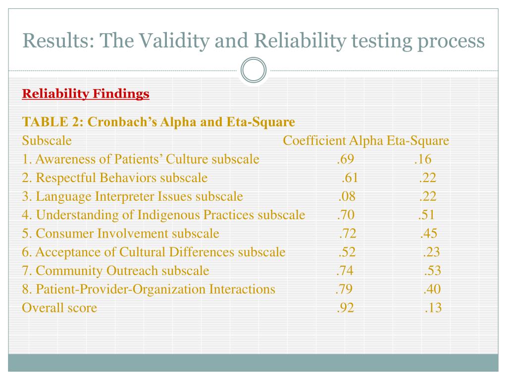 Results: The Validity and Reliability testing process Reliability Findings TABLE 2: Cronbach’s Alpha and Eta-Square Subscale Coefficient Alpha Eta-Square 1. Awareness of Patients’ Culture subscale .69 .16 2. Respectful Behaviors subscale .61 .22 3. Language Interpreter Issues subscale .08 .22 4. Understanding of Indigenous Practices subscale .70 .51 5. Consumer Involvement subscale .72 .45 6. Acceptance of Cultural Differences subscale .52 .23 7. Community Outreach subscale .74 .53 8. Patient-Provider-Organization Interactions .79 .40 Overall score .92 .13