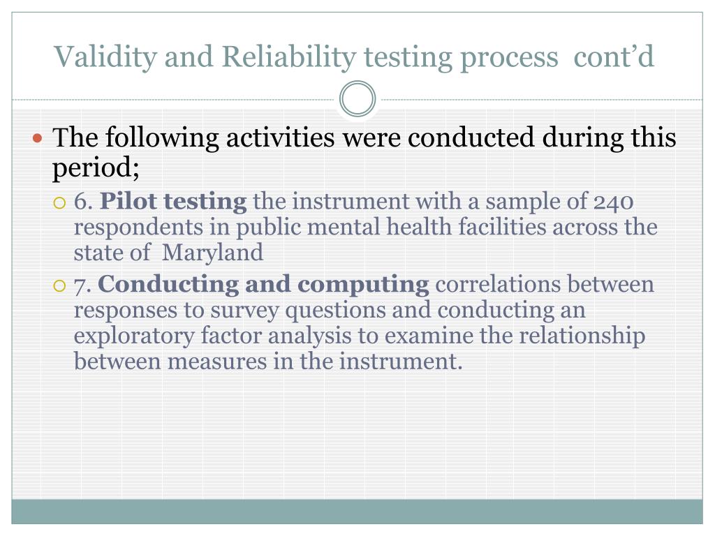 Validity and Reliability testing process cont’d • The following activities were conducted during this period; • 6. Pilot testing the instrument with a sample of 240 respondents in public mental health facilities across the state of Maryland • 7. Conducting and computing correlations between responses to survey questions and conducting an exploratory factor analysis to examine the relationship between measures in the instrument.