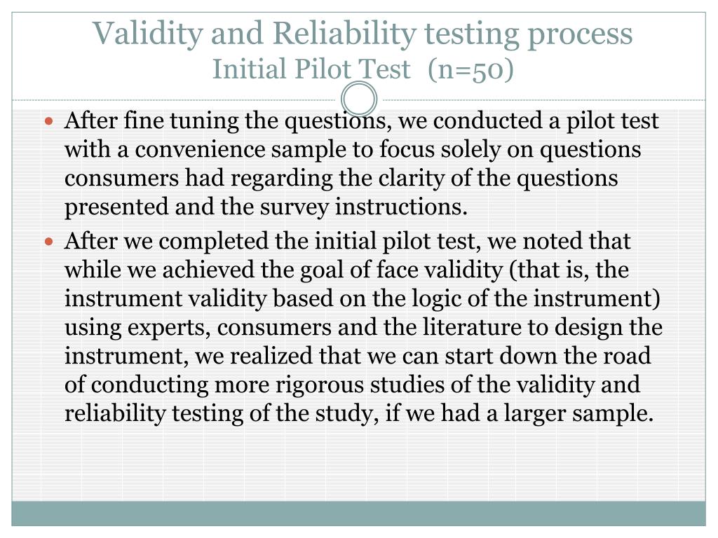 Validity and Reliability testing process Initial Pilot Test (n=50) • After fine tuning the questions, we conducted a pilot test with a convenience sample to focus solely on questions consumers had regarding the clarity of the questions presented and the survey instructions. • After we completed the initial pilot test, we noted that while we achieved the goal of face validity (that is, the instrument validity based on the logic of the instrument) using experts, consumers and the literature to design the instrument, we realized that we can start down the road of conducting more rigorous studies of the validity and reliability testing of the study, if we had a larger sample.