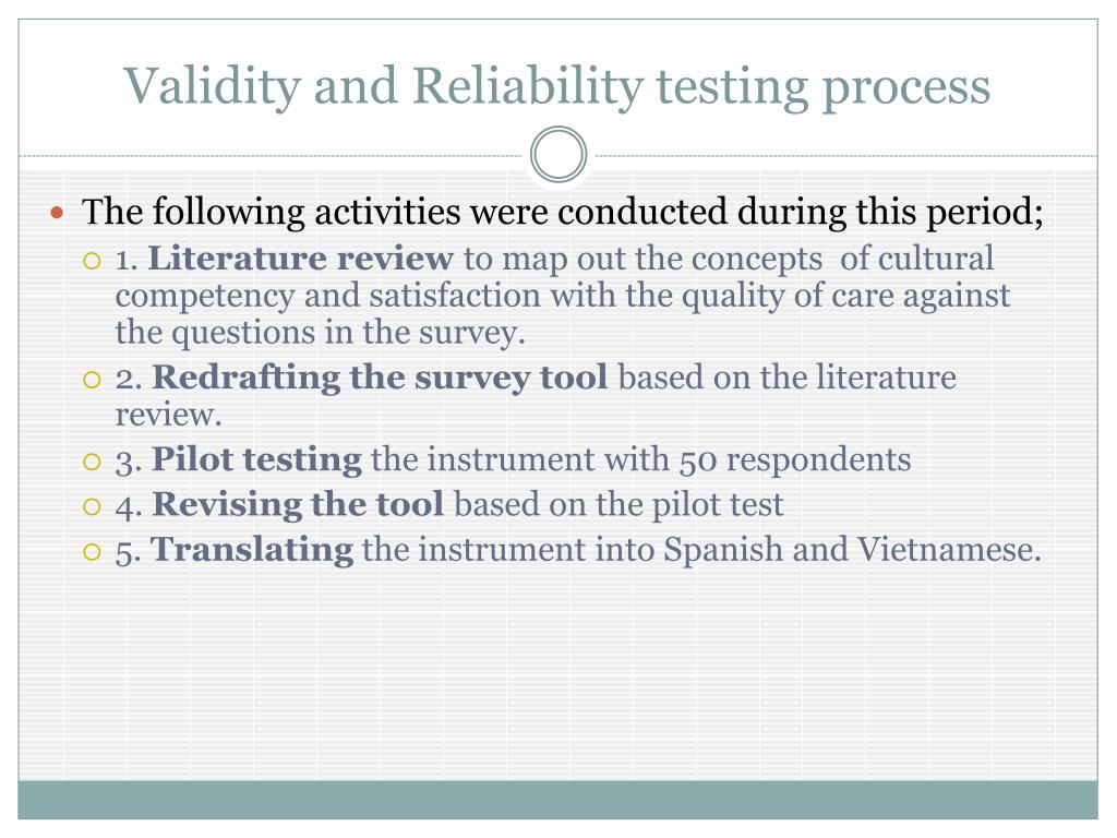 Validity and Reliability testing process • The following activities were conducted during this period; • 1. Literature review to map out the concepts of cultural competency and satisfaction with the quality of care against the questions in the survey. • 2. Redrafting the survey tool based on the literature review. • 3. Pilot testing the instrument with 50 respondents • 4. Revising the tool based on the pilot test • 5. Translating the instrument into Spanish and Vietnamese.