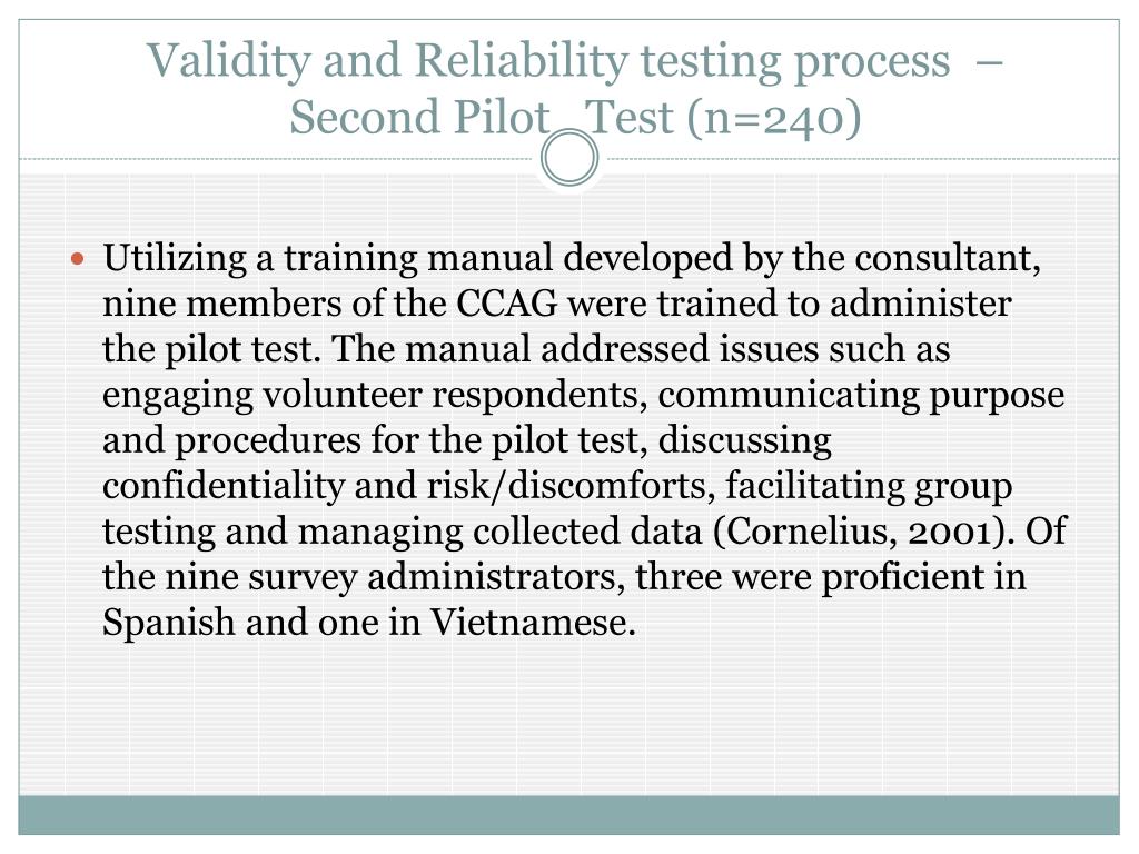 Validity and Reliability testing process –Second Pilot Test (n=240) • Utilizing a training manual developed by the consultant, nine members of the CCAG were trained to administer the pilot test. The manual addressed issues such as engaging volunteer respondents, communicating purpose and procedures for the pilot test, discussing confidentiality and risk/discomforts, facilitating group testing and managing collected data (Cornelius, 2001). Of the nine survey administrators, three were proficient in Spanish and one in Vietnamese.