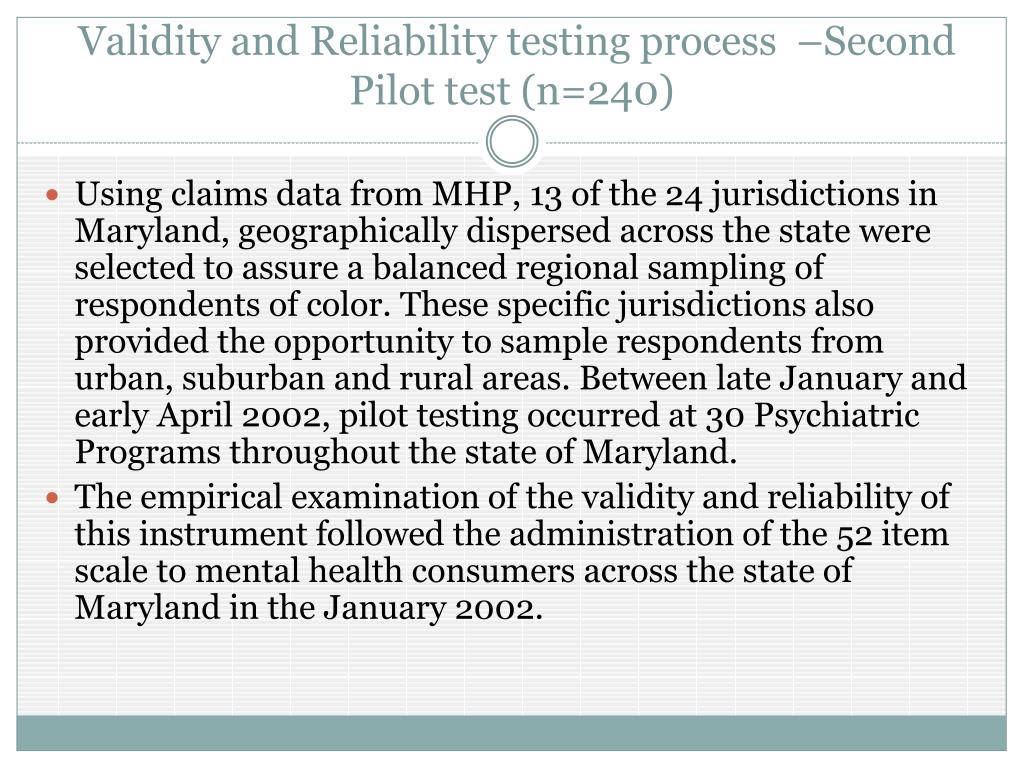 Validity and Reliability testing process –Second Pilot test (n=240) • Using claims data from MHP, 13 of the 24 jurisdictions in Maryland, geographically dispersed across the state were selected to assure a balanced regional sampling of respondents of color. These specific jurisdictions also provided the opportunity to sample respondents from urban, suburban and rural areas. Between late January and early April 2002, pilot testing occurred at 30 Psychiatric Programs throughout the state of Maryland. • The empirical examination of the validity and reliability of this instrument followed the administration of the 52 item scale to mental health consumers across the state of Maryland in the January 2002.