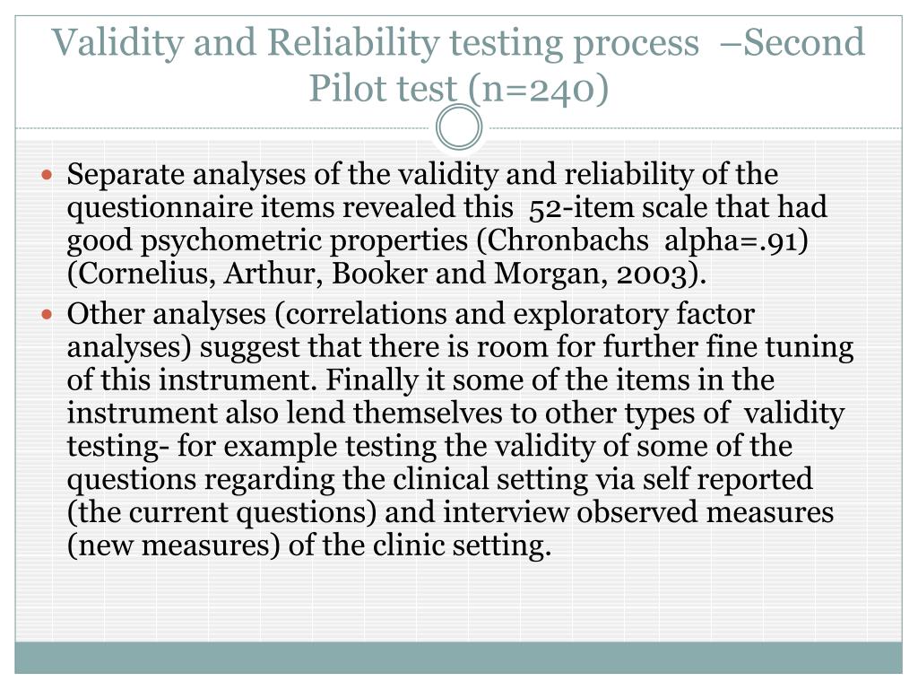 Validity and Reliability testing process –Second Pilot test (n=240) • Separate analyses of the validity and reliability of the questionnaire items revealed this 52-item scale that had good psychometric properties (Chronbachs alpha=.91) (Cornelius, Arthur, Booker and Morgan, 2003). • Other analyses (correlations and exploratory factor analyses) suggest that there is room for further fine tuning of this instrument. Finally it some of the items in the instrument also lend themselves to other types of validity testing- for example testing the validity of some of the questions regarding the clinical setting via self reported (the current questions) and interview observed measures (new measures) of the clinic setting.