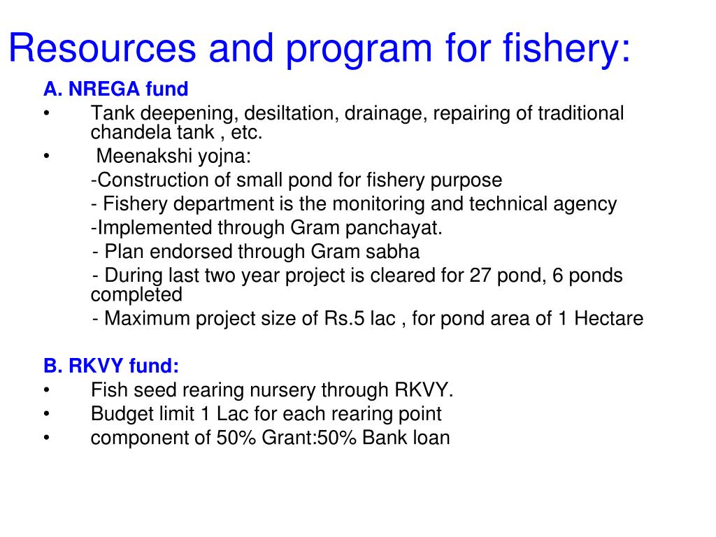 Resources and program for fishery: A. NREGA fund • Tank deepening, desiltation, drainage, repairing of traditional chandela tank , etc. • Meenakshi yojna: -Construction of small pond for fishery purpose - Fishery department is the monitoring and technical agency -Implemented through Gram panchayat. - Plan endorsed through Gram sabha - During last two year project is cleared for 27 pond, 6 ponds completed - Maximum project size of Rs.5 lac , for pond area of 1 Hectare B. RKVY fund: • Fish seed rearing nursery through RKVY. • Budget limit 1 Lac for each rearing point • component of 50% Grant:50% Bank loan