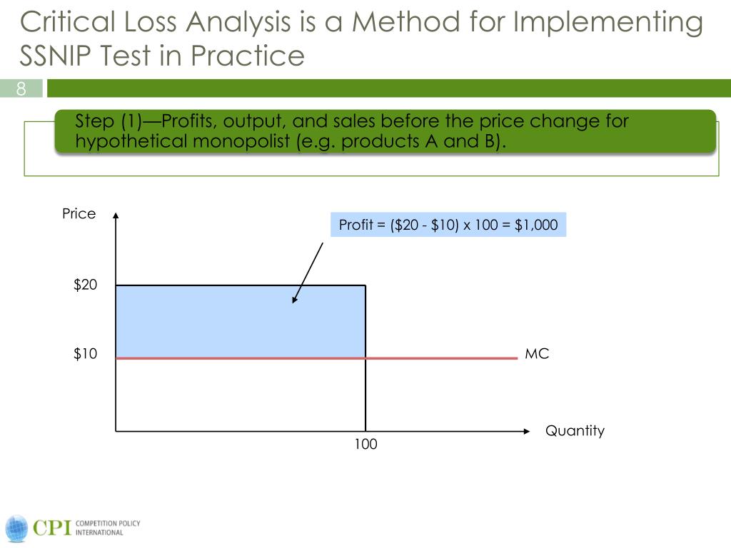 Critical Loss Analysis is a Method for Implementing SSNIP Test in Practice Price Profit = ($20 - $10) x 100 = $1,000 $20 $10 MC Quantity 100