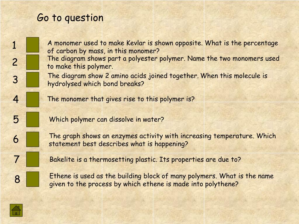 Go to question A monomer used to make Kevlar is shown opposite. What is the percentage of carbon by mass, in this monomer? 1 The diagram shows part a polyester polymer. Name the two monomers used to make this polymer. 2 The diagram show 2 amino acids joined together.When this molecule is hydrolysed which bond breaks? 3 4 The monomer that gives rise to this polymer is? 5 Which polymer can dissolve in water? The graph shows an enzymes activity with increasing temperature. Which statement best describes what is happening? 6 7 Bakelite is a thermosetting plastic. Its properties are due to? Ethene is used as the building block of many polymers. What is the name given to the process by which ethene is made into polythene? 8