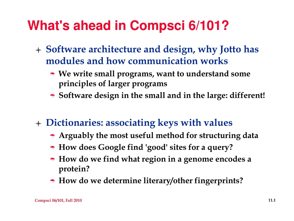 What's ahead in Compsci 6/101? • Software architecture and design, why Jotto has modules and how communication works • We write small programs, want to understand some principles of larger programs • Software design in the small and in the large: different! • Dictionaries: associating keys with values • Arguably the most useful method for structuring data • How does Google find 'good' sites for a query? • How do we find what region in a genome encodes a protein? • How do we determine literary/other fingerprints?