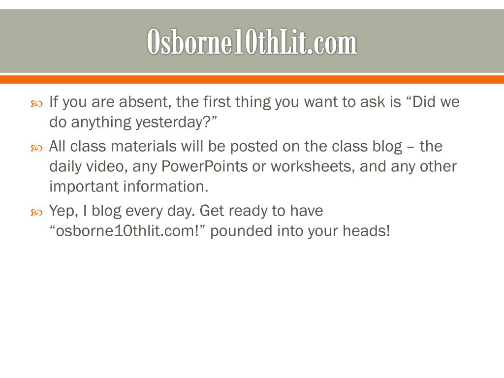 Osborne10thLit.com • If you are absent, the first thing you want to ask is “Did we do anything yesterday?” • All class materials will be posted on the class blog – the daily video, any PowerPoints or worksheets, and any other important information. • Yep, I blog every day. Get ready to have “osborne10thlit.com!” pounded into your heads!