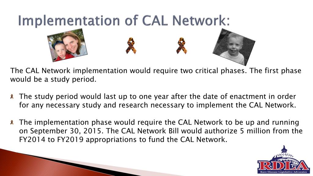 Implementation of CAL Network: • The CAL Network implementation would require two critical phases. The first phase would be a study period. • The study period would last up to one year after the date of enactment in order for any necessary study and research necessary to implement the CAL Network. • The implementation phase would require the CAL Network to be up and running on September 30, 2015. The CAL Network Bill would authorize 5 million from the FY2014 to FY2019 appropriations to fund the CAL Network.