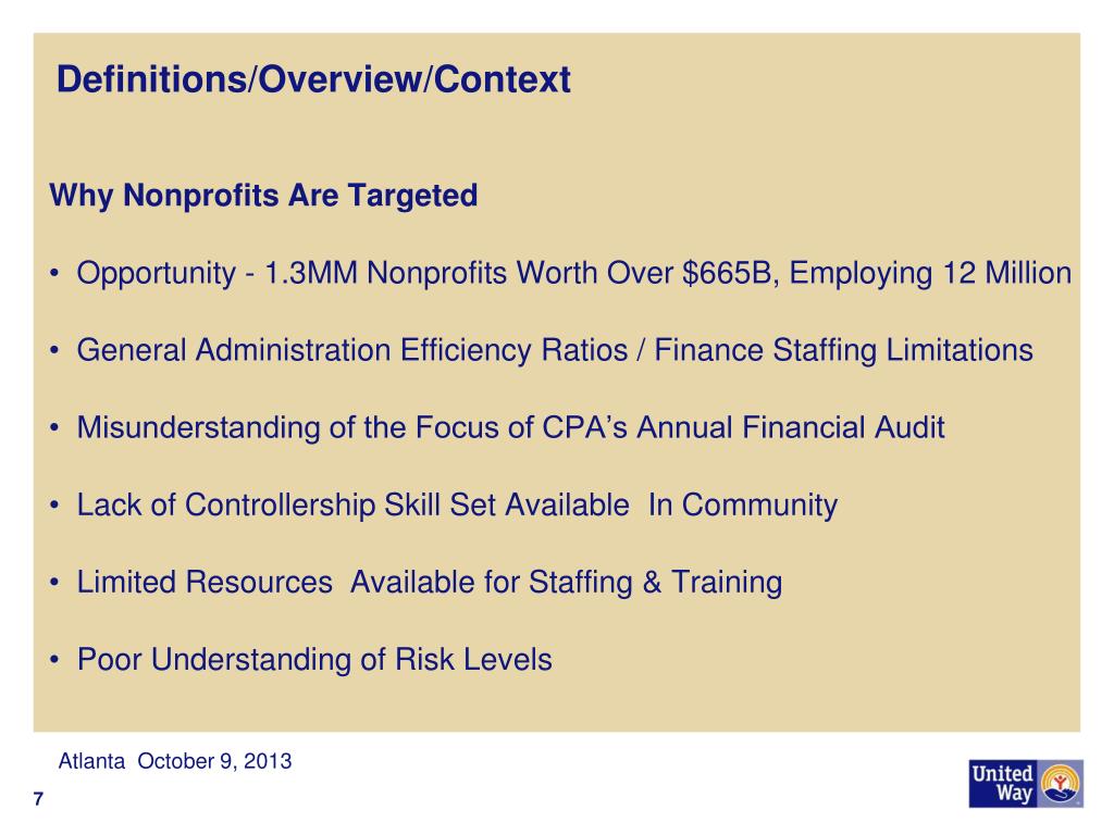 Definitions/Overview/Context • Why Nonprofits Are Targeted • Opportunity - 1.3MM Nonprofits Worth Over $665B, Employing 12 Million • General Administration Efficiency Ratios / Finance Staffing Limitations • Misunderstanding of the Focus of CPA’s Annual Financial Audit • Lack of Controllership Skill Set Available In Community • Limited Resources Available for Staffing & Training • Poor Understanding of Risk Levels Atlanta October 9, 2013