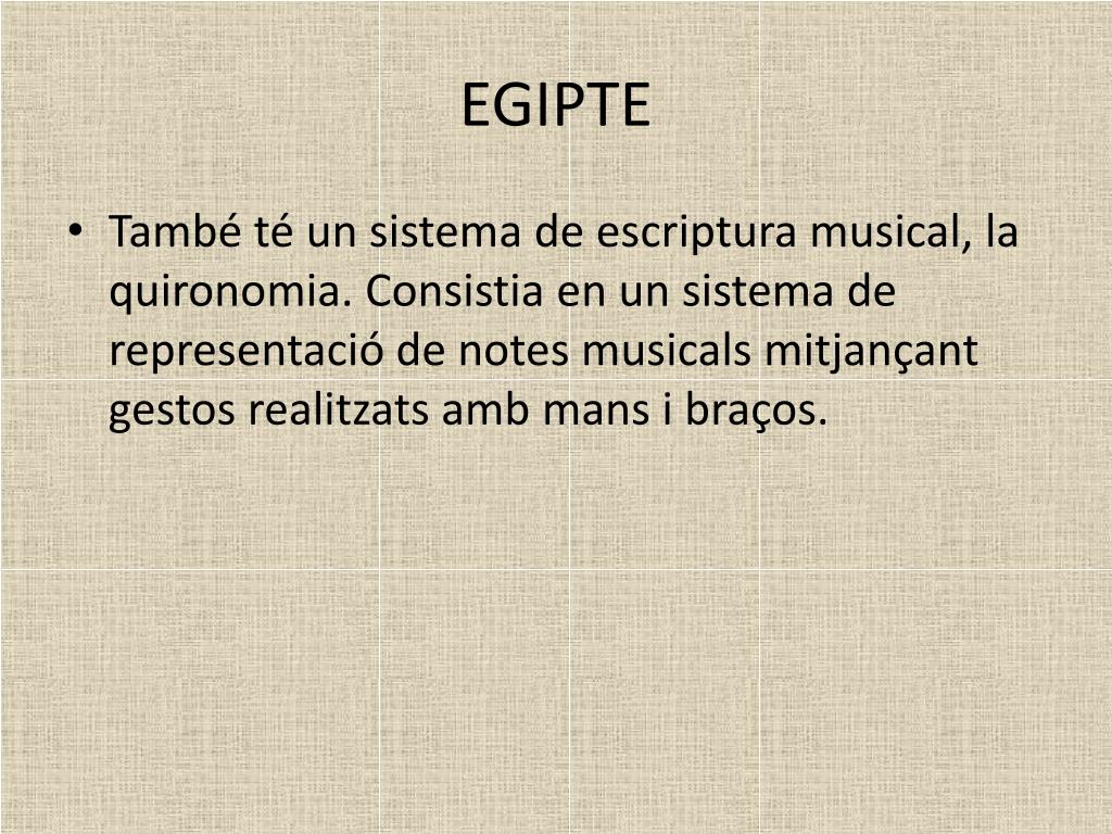EGIPTE • També té un sistema de escriptura musical, la quironomia. Consistia en un sistema de representació de notes musicals mitjançant gestos realitzats amb mans i braços.