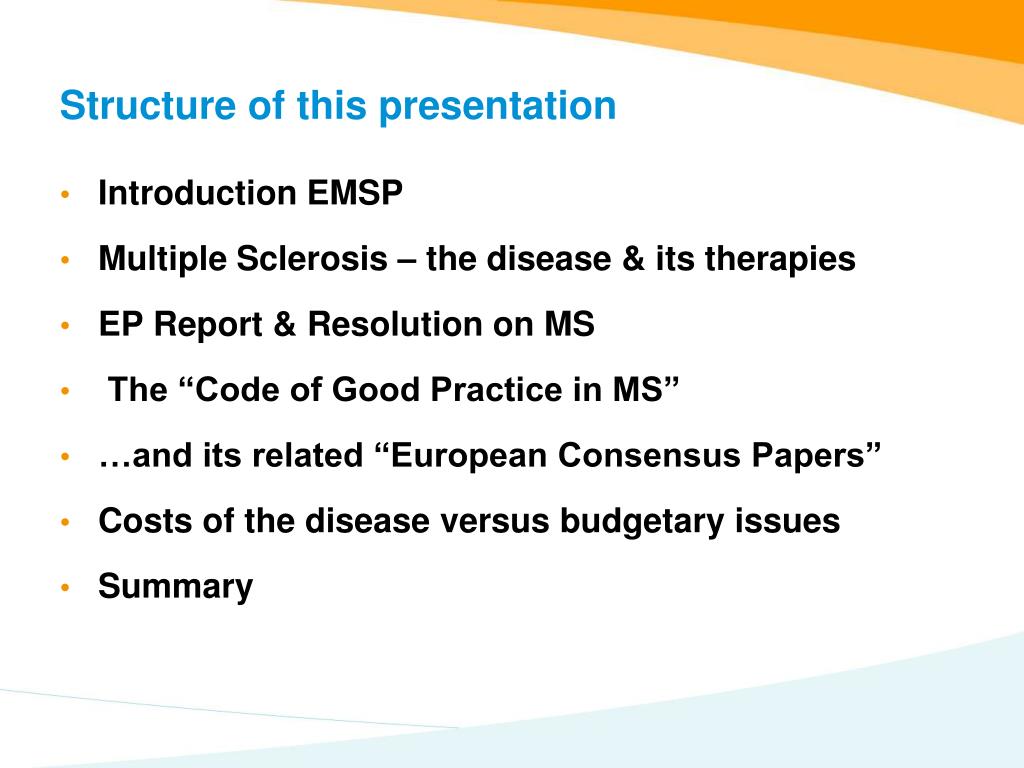 Structure of this presentation • Introduction EMSP • Multiple Sclerosis – the disease & its therapies • EP Report & Resolution on MS • The “Code of Good Practice in MS” • …and its related “European Consensus Papers” • Costs of the disease versus budgetary issues • Summary
