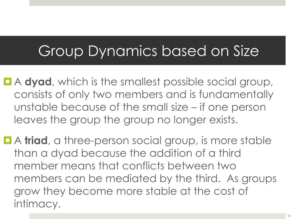 Group Dynamics based on Size • A dyad, which is the smallest possible social group, consists of only two members and is fundamentally unstable because of the small size – if one person leaves the group the group no longer exists. • A triad, a three-person social group, is more stable than a dyad because the addition of a third member means that conflicts between two members can be mediated by the third. As groups grow they become more stable at the cost of intimacy.