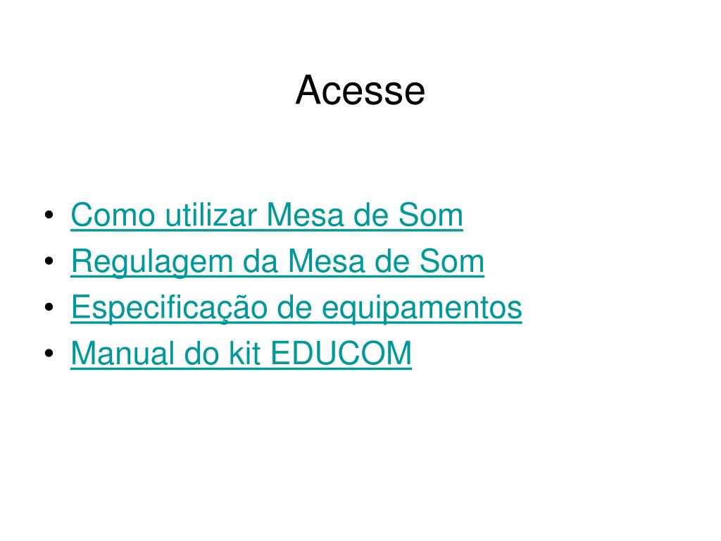 Acesse • Como utilizar Mesa de Som • Regulagem da Mesa de Som • Especificação de equipamentos • Manual do kit EDUCOM