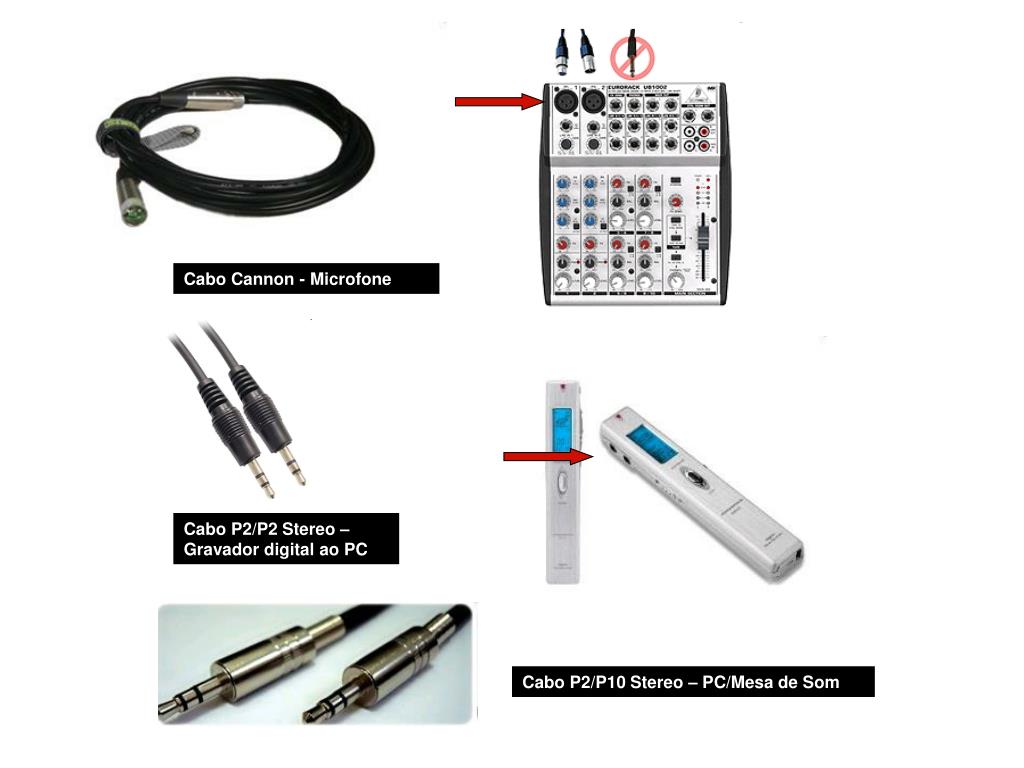 Cabo Cannon - Microfone Cabo P2/P2 Stereo – Gravador digital ao PC Cabo P2/P10 Stereo – PC/Mesa de Som