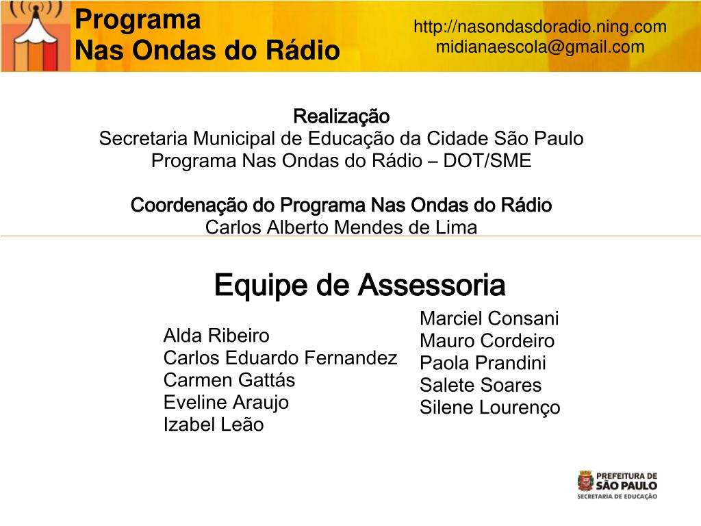 Programa Nas Ondas do Rádio http://nasondasdoradio.ning.com midianaescola@gmail.com Realização Secretaria Municipal de Educação da Cidade São Paulo Programa Nas Ondas do Rádio – DOT/SME Coordenação do Programa Nas Ondas do Rádio Carlos Alberto Mendes de Lima Equipe de Assessoria Alda Ribeiro Carlos Eduardo Fernandez Carmen Gattás Eveline Araujo Izabel Leão Marciel Consani Mauro Cordeiro Paola Prandini Salete Soares Silene Lourenço