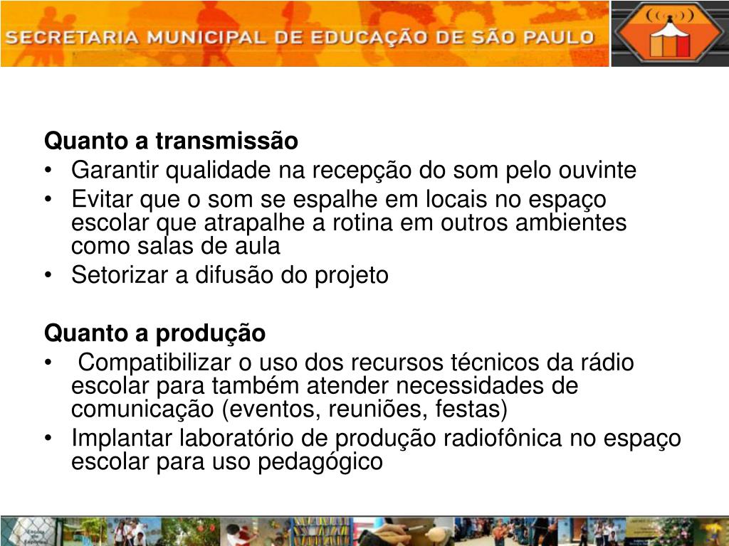 Quanto a transmissão • Garantir qualidade na recepção do som pelo ouvinte • Evitar que o som se espalhe em locais no espaço escolar que atrapalhe a rotina em outros ambientes como salas de aula • Setorizar a difusão do projeto Quanto a produção • Compatibilizar o uso dos recursos técnicos da rádio escolar para também atender necessidades de comunicação (eventos, reuniões, festas) • Implantar laboratório de produção radiofônica no espaço escolar para uso pedagógico