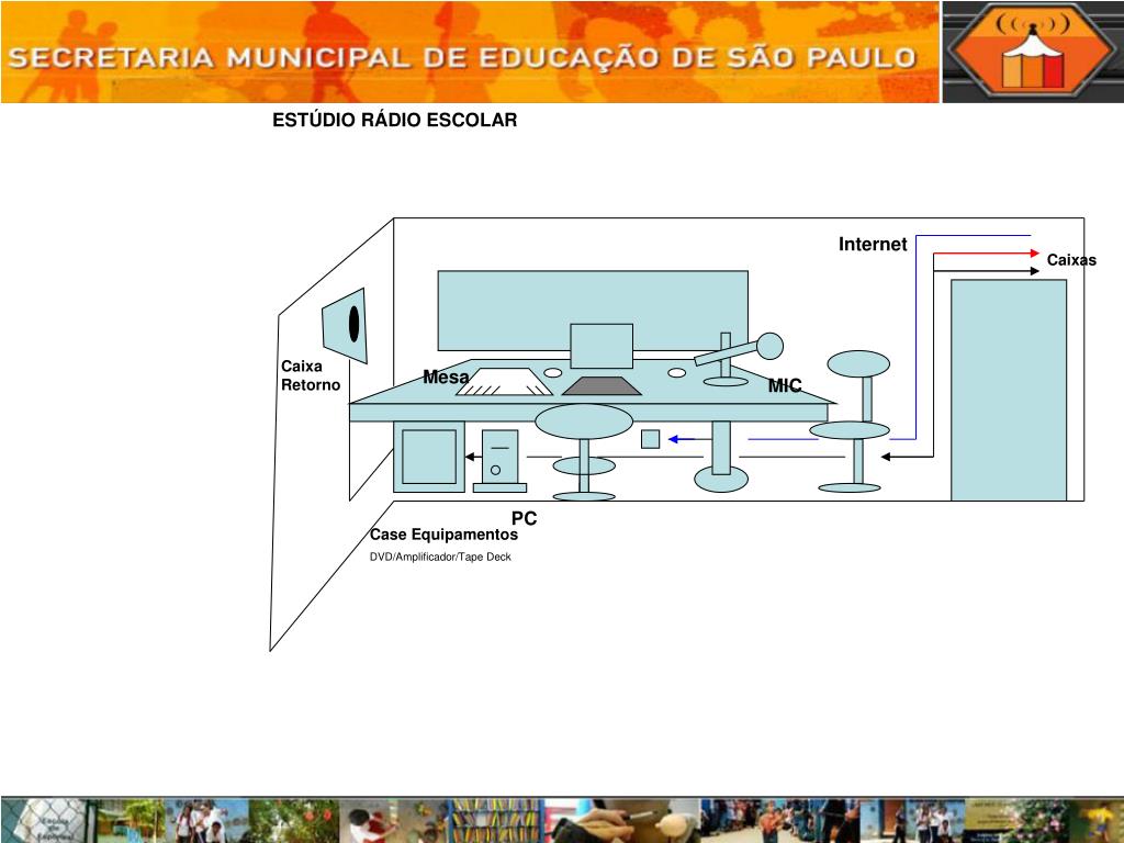 ESTÚDIO RÁDIO ESCOLAR Internet Caixas Caixa Retorno Mesa MIC PC Case Equipamentos DVD/Amplificador/Tape Deck